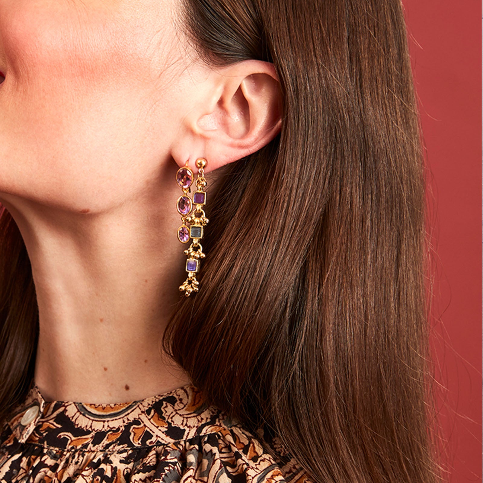 Leur diversité est vertigineuse : longues et filigranées, en clous géométriques, pendantes, incrustées de pierres semi-précieuses, ou martelées à la main. Fabriquées en petite série, elles incarnent cette rareté précieuse qui fait toute la différence. À l’opposé de la production industrielle, elles cultivent l’unique. Chaque paire est un monde. Et ce monde est nourri d’inspiration indienne.