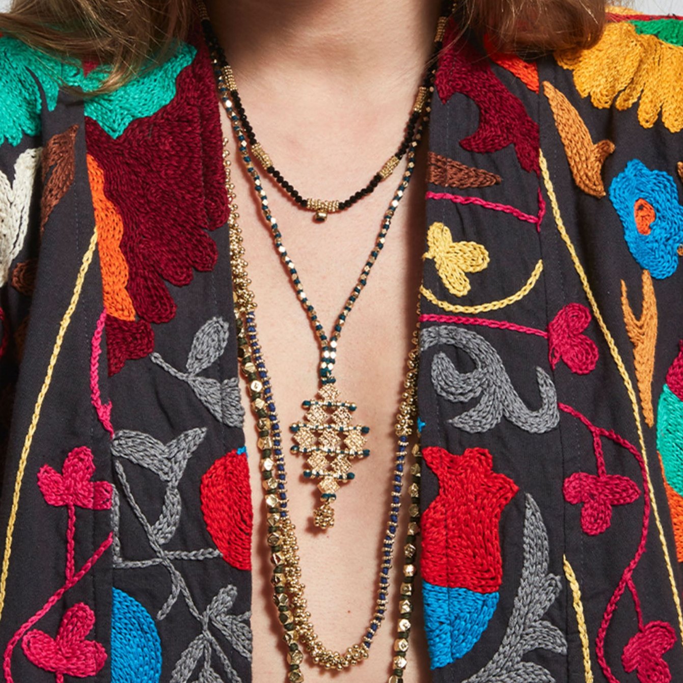 Certains modèles s’inspirent du textile. On y trouve les codes du foulard, les imprimés du block print, les textures du pashmina. À ce titre, le collier pashmina est plus qu’un collier : c’est un tissage ornemental, une pièce hybride entre textile et bijou.