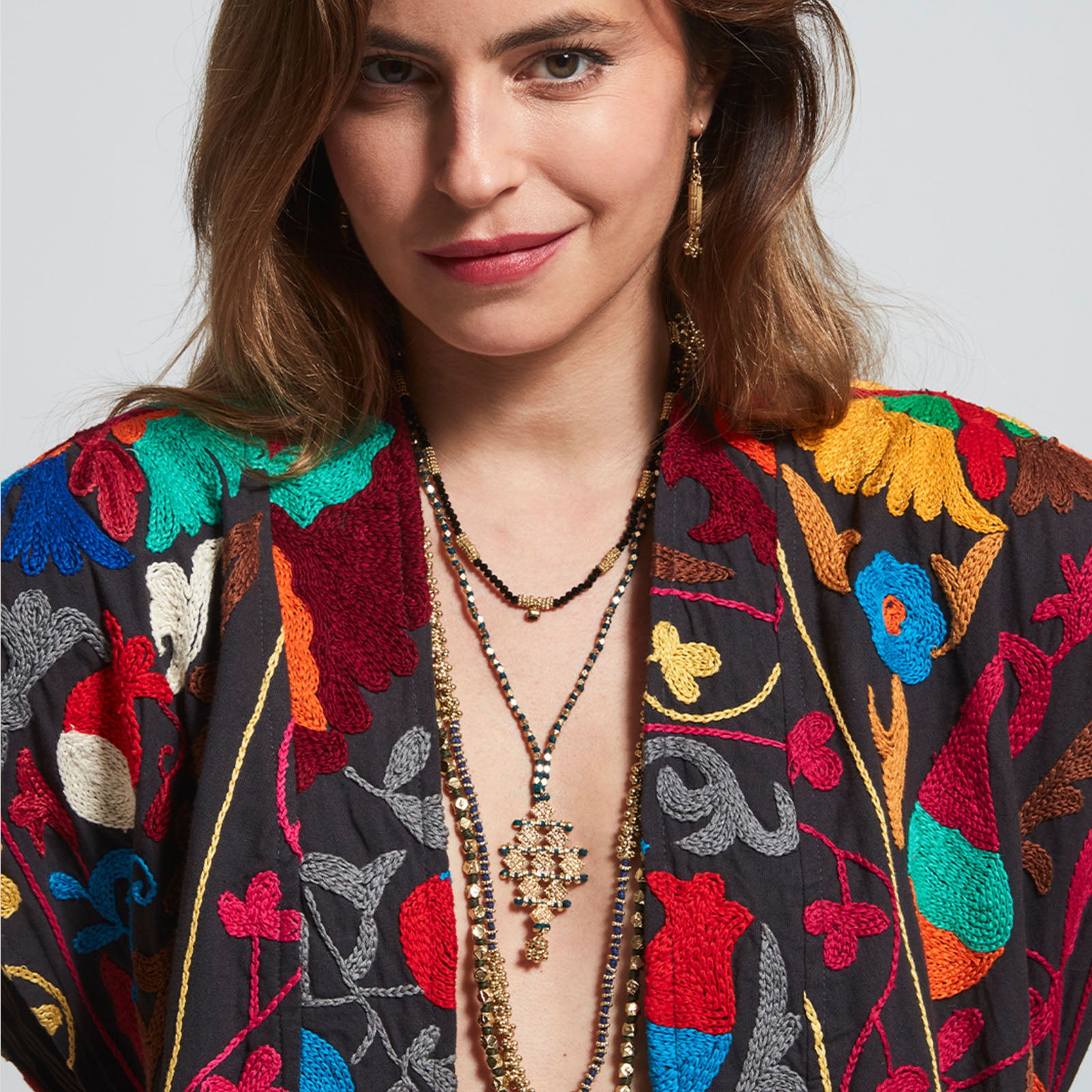 Et pour jouer l’accumulation, rien de tel que d’y associer une bague indienne, pensée comme un prolongement symbolique, ou des boucles d'oreilles indiennes, pour composer une silhouette complète.
